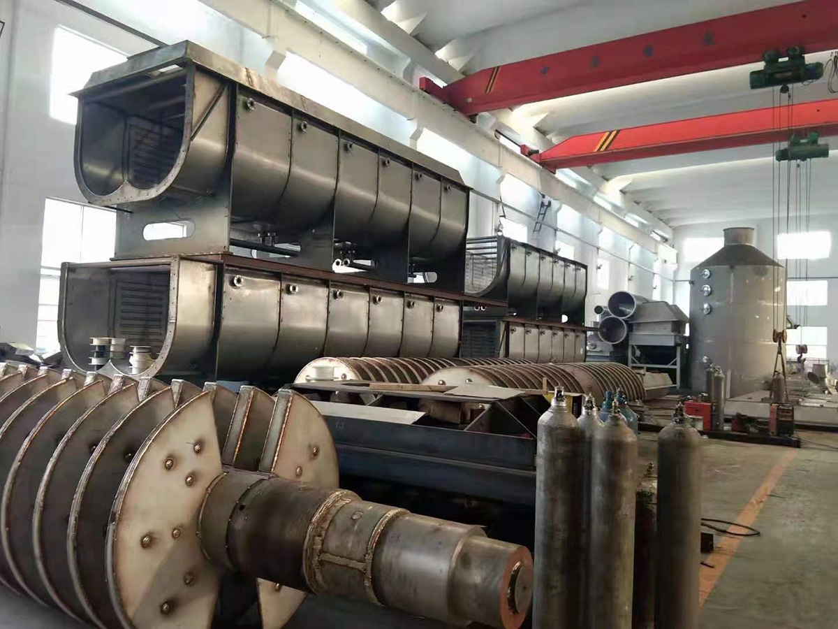 2.主轴搅拌部分:主要由两根空心轴和其表面若干个楔形空心桨叶等组成。空心轴内设置传热(加热或冷却)介质(蒸汽、水、油等)回流管,两端或单端配置的旋转接头是这些介质进出的接口。运行时主轴搅拌部分对物料搅拌、推挤并进行加热或冷却。