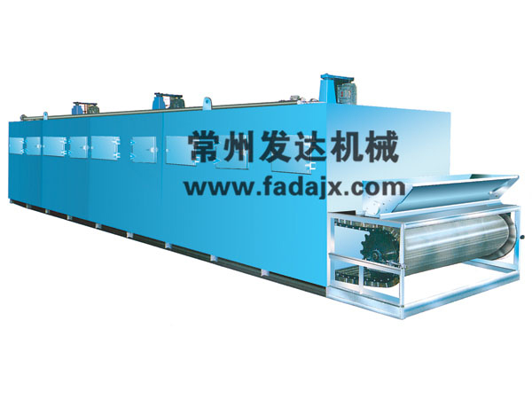 物料由加料器均匀地铺在网面上,网面采用12-60目不锈钢丝网,由传动装置拖动在干燥机内移动。干燥机由若干单元组成,每一单元热风独立循环,其中部分尾气由专门排湿风机排出,每一单元排出废气时均有调节阀控制。热气由上往下或由下往上穿过铺满物料的网面完成热量与质量传递的进程,带走物料水分。网面缓慢移动,运行速度可根据物料温度自由调节,干燥后的成品连续落入收料器中。上下循环单元根据用户需要可灵活配备,单元数量亦可根据需要选取。