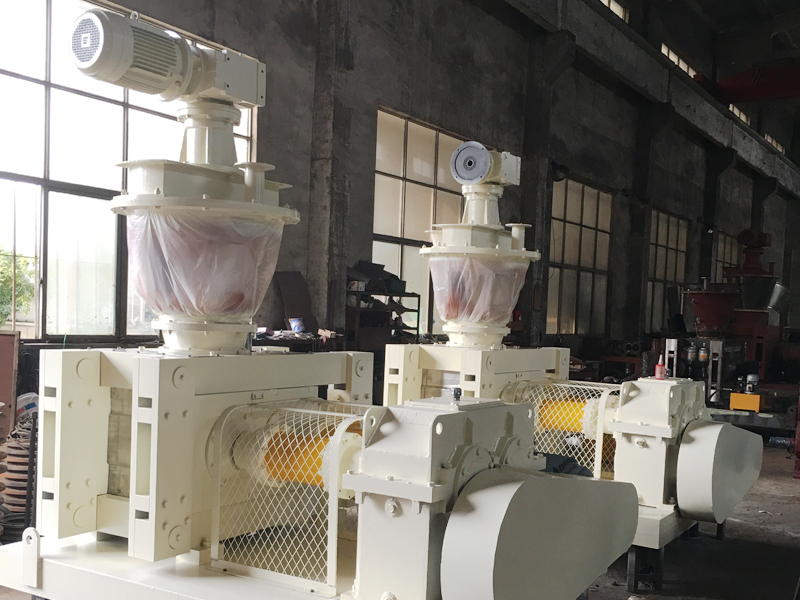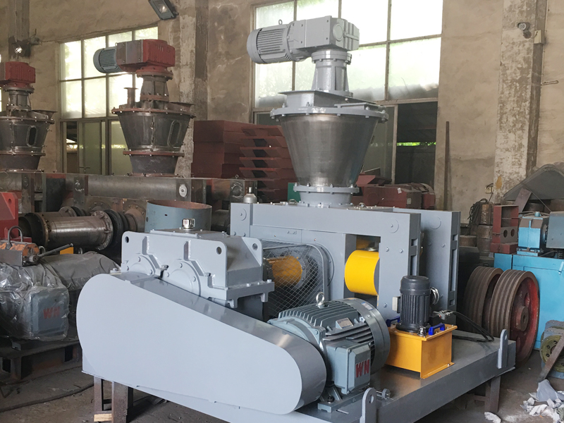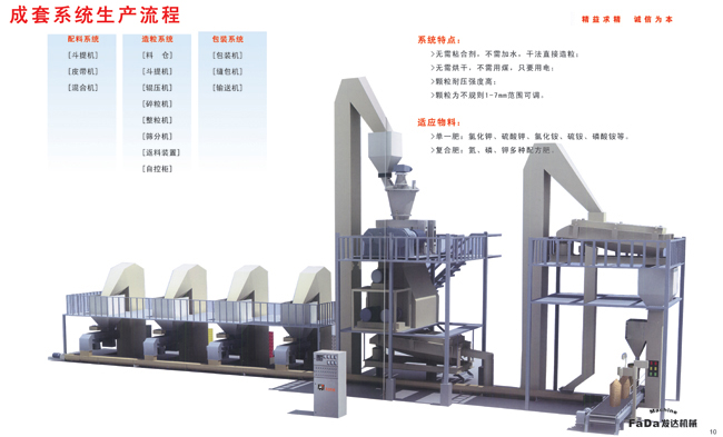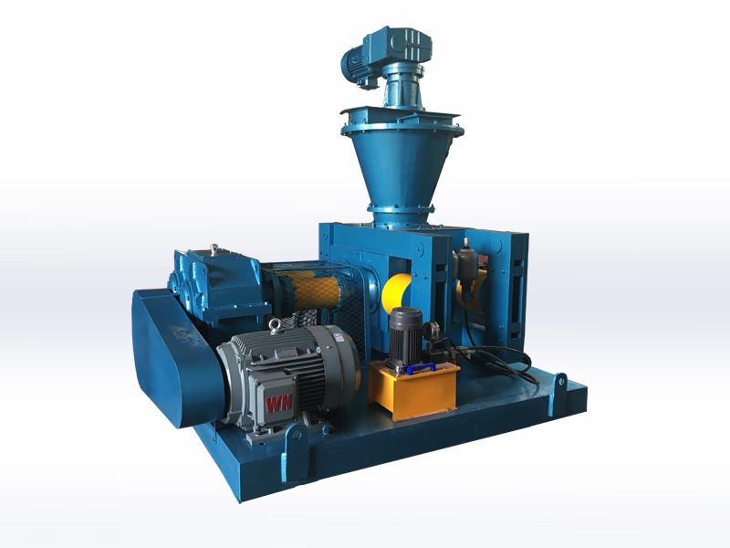 各种干粉物料从设备顶部加入,经脱气、螺旋预压缩并输送至两只轧辊的弧形槽口,两只轧辊等速、反向旋转,将物料咬入槽内并进行强制压缩,物料通过压缩区后承受的压力逐渐减小,其表面张力和重力使之自然脱出,进入碎粒机和整粒机破碎、修整、再进入振动筛进行筛分,合格品通过输送机被送入成品仓或直接包装,粉状筛下物料通过回料装置再次被送回原料仓进行二次辊压,挤压力的大小可根据颗粒强度的需要由液压系统进行调节。通过改变辊面开槽形式,可得到片状、条状、橄榄状、扁球状、枕形状等物料。